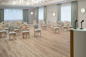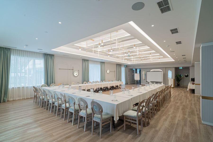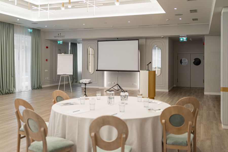 Un avantaj important al salii de conferinta este ieșirea directă pe terasă, care se deschide către o grădină interioară primitoare – un spațiu ideal pentru coffee break-uri în aer liber, sesiuni de networking sau momente de relaxare între prezentări.