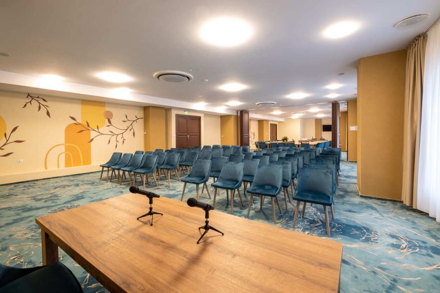 Sala de evenimente Ioana – Pentru conferințe cu un număr mare de participanți, vă oferim posibilitatea de a rezerva sala de evenimente, cunoscută sub numele de Salon de Evenimente Ioana. Acest spațiu elegant poate găzdui până la 200 de persoane și este dotat cu facilități concepute pentru a satisface nevoile diversificate ale evenimentelor corporate.