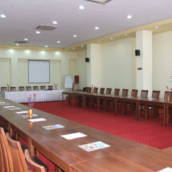 Doriti sa organizati un eveniment important pentru compania dumneavoastra? Hotel Vera iti poate oferi spatiul ideal! Workshop-uri, lansari de produs, seminarii, intalniri de afaceri sau cluburi pentru copii, indiferent de ocazie, dumneavoastra ne spuneti cum va imaginati evenimentul – noi ne ocupam de restul detaliilor! Situat la etajul unu a corpului C, sala de conferinte are o suprafata de 165 m2 si o capacitate de 120 de persoane. Putem pune la dispozitie un echipament standard ( videoproiector, ecran de proiectie, Wi-Fi, flipchart, etc.).