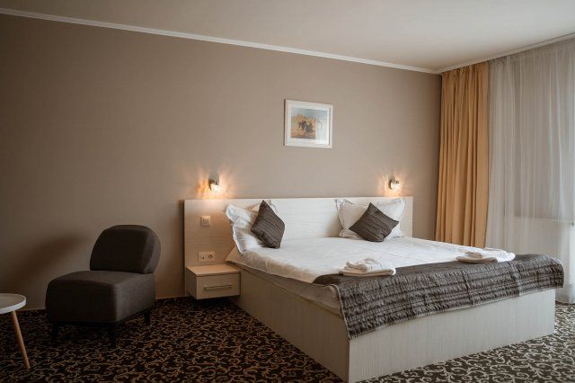 - 14 CAMERE comfortabile, toate spaţiile de cazare fiind dotate cu: minibar, televizor, cablu TV, telefon, internet wireless, baie proprie cu duş şi uscător de păr, climatizare, balcon