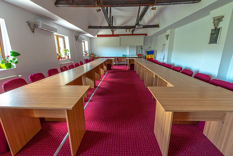 - Sala de sedinte: dotata cu videoproiector, ecran de proiectie, flip-chart, accesorii flip-chart, wi-fi, sonorizare. Capacitate de maxim 50 de locuri (teatru) si 35 locuri (U-shape)