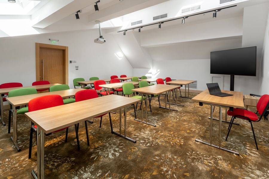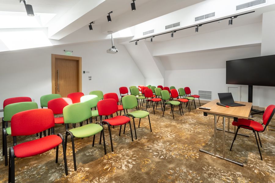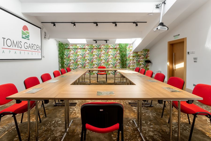 Sala beneficiaza de lumina naturala, sistem de climatizare cald/rece, spatiu modular-fara stalpi si este dotata cu cele mai noi echipamente pentru a raspunde diverselor cerinte in domeniu, putand fi adaptate in functie de specificul fiecarui tip de eveniment.