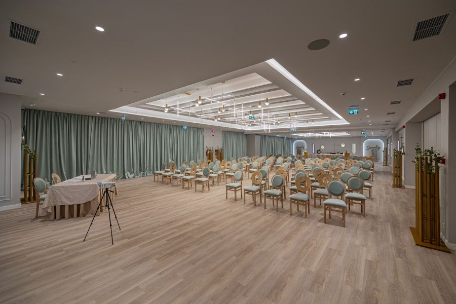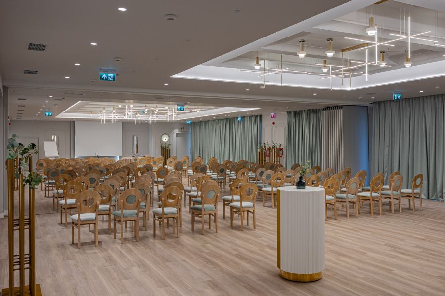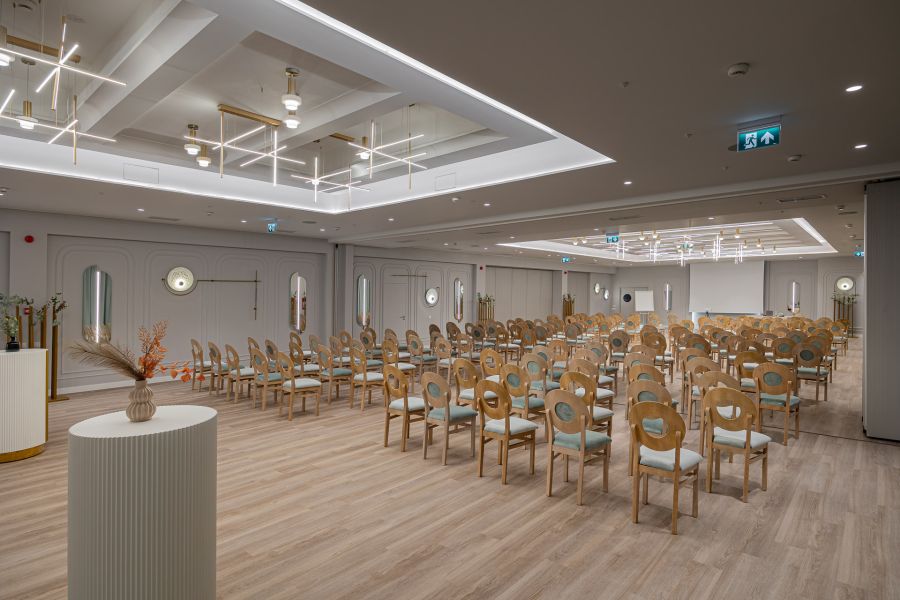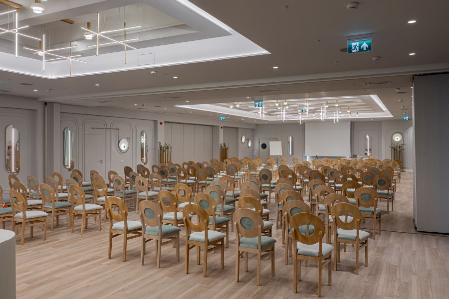 Sala de conferinte Serenity, parte din elegantul hotel Bavaria Blu de pe litoralul Mării Negre, este spațiul perfect pentru evenimente corporate, conferințe, mese rotunde, cine festive și întâlniri de business networking. Cu un ambient modern și servicii premium, Serenity oferă un cadru profesionist și rafinat pentru orice tip de întâlnire de afaceri. Salonul este complet echipat cu ecran de proiecție, videoproiector, sistem de sonorizare, microfon wireless și infrastructură audio-video performantă, asigurând condițiile ideale pentru prezentări, workshopuri, traininguri și paneluri. Configurația spațiului este flexibilă, adaptându-se formatului dorit: conferințe, mese rotunde, cine corporate sau evenimente tip networking dinner.